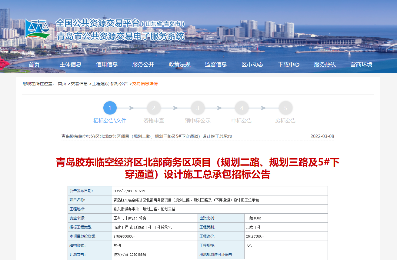 On March 8, 2022, the Qingdao Municipal Public Resource Trading Electronic Service System released the bidding announcement for the general contracting of the design and construction of the northern business district project of Qingdao Jiaodong Airport Economic Zone (Planning No. 2 Road, Planning No. 3 Road and 5# Underpass), which belongs to the industry. Municipal, the tenderer Qingdao Linkong Economic Zone Construction Co., Ltd., the total investment of the project is 2.75 billion yuan.