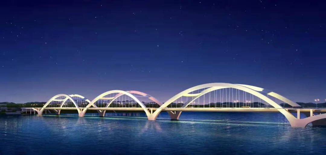 水都二桥位于湖北丹江口水都大桥下游约310米、沧浪洲步行桥上游800米处,起自左岸城区均州一路,跨越汉江后接右岸城区石家庄路,大桥全长1346.6米,双向四车道+两个非机动车道+两个人行道,主桥面宽34.3米,引桥宽29米。主桥方案采用3*225钢箱系杆拱桥,工程建安投资约7亿元,工期24个月。