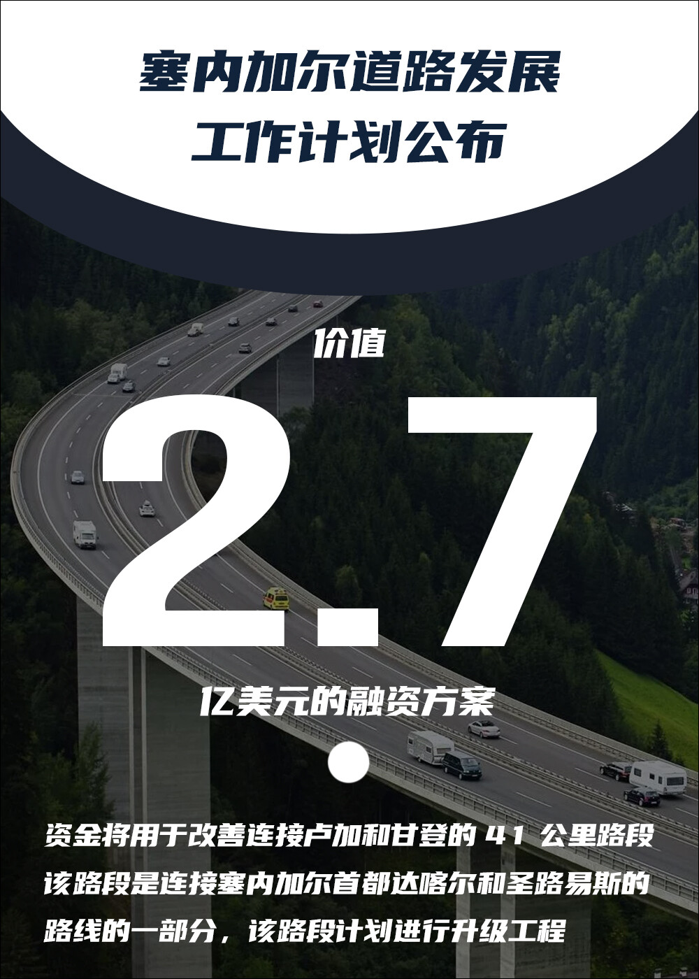 资金将用于改善连接卢加和甘登的41公里路段。该路段是连接塞内加尔首都达喀尔和圣路易斯的路线的一部分,该路段计划进行升级工程。关键词:工程施工、工程新闻
