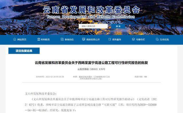 为提升云南省县域高速公路互联互通水平,加快融入一带一路和长江经济带,促进沿边地区经济社会发展,近日,云南省发展和改革委员会对西畴至富宁高速公路工程可行性研究报告进行批复,原则同意该工程建设,要求文山州发展和改革委员会尽快开展初步设计阶段工作,初步设计完成后按程序报批。