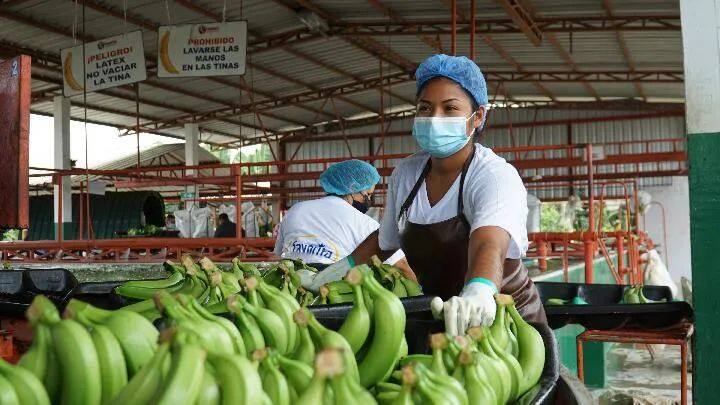 2021年10月28日,工人在厄瓜多尔洛斯里奥斯省太平洋香蕉王公司的一处种植基地处理待出口的香蕉