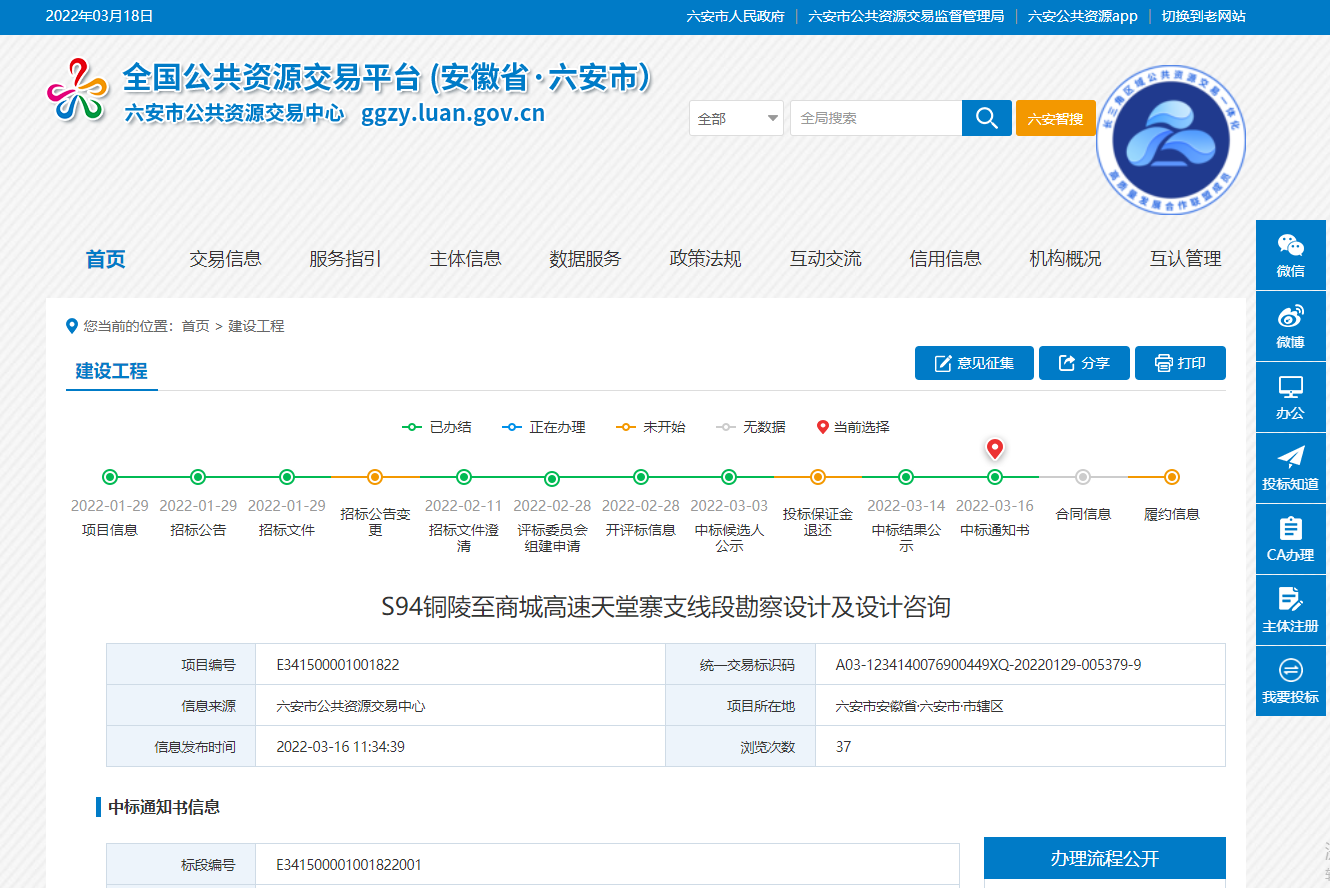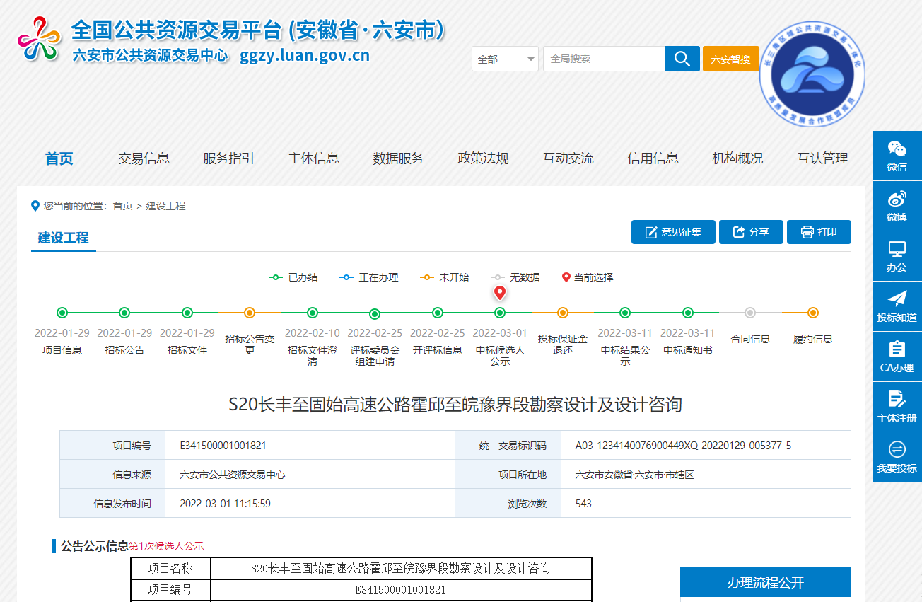 قسم حدود S20 Changfeng-Gushi Expressway Huoqiu-Wanyu ، يعتمد الخط بأكمله معيار تصميم الطريق السريع: المسافة المقطوعة حوالي 55 كم ، وسرعة التصميم 120 كم / ساعة ، والمسار ثنائي الاتجاه بأربعة حارات. يبلغ اجمالى الاستثمار المخطط له للمشروع حوالى 7.15 مليار يوان. تنقسم هذه العطاءات إلى قسمين: 01 مسح وتصميم قسم العطاءات: أقصى حد للمناقصة هو 47.46 مليون يوان ؛ 02 مسح قسم العطاءات واستشارات التصميم: أعلى حد للمناقصة هو 1890.000 يوان. فازت شركة Anhui Provincial Transportation Planning، Design and Research Institute Co.، Ltd. باستطلاع وتصميم وتصميم المشروع. محرر / سانج شياومي