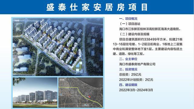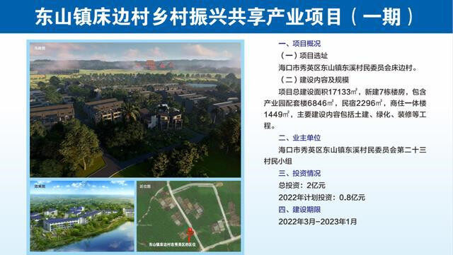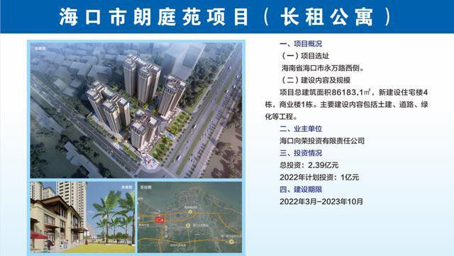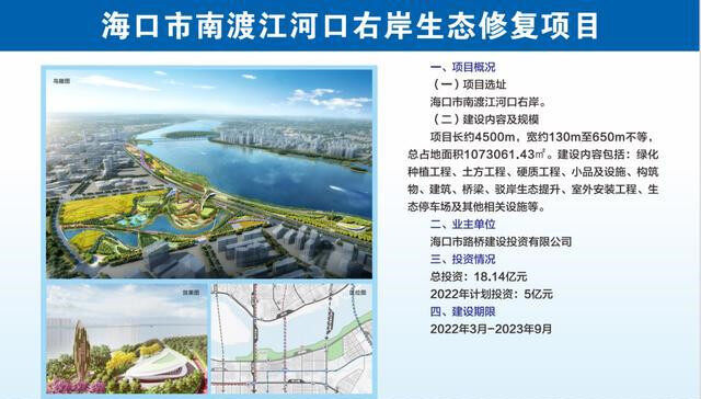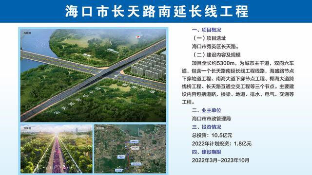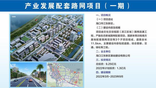 此次集中开工的9个项目分别为:海口市长天路南延长线工程、产业发展配套路网项目(一期)、盛泰仕家安居房项目、海口冲浪里酒店办公项目、海口市朗庭苑项目(长租公寓)、东山镇床边村乡村振兴共享产业项目(一期)、海凭国际·海口高新区医疗器械产业项目、恒力海南区域总部大楼项目、海口市南渡江河口右岸生态修复项目。