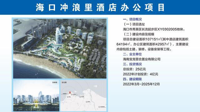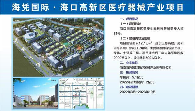 2022年3月18日,海南省海口市第二批重大项目集中开工活动在海口国家高新区美安生态科技新城海凭国际·海口高新区医疗器械产业项目现场举行。据海口市发改部门介绍,此次集中开工项目共9个,总投资101亿元,2022年计划投资18.6亿元。