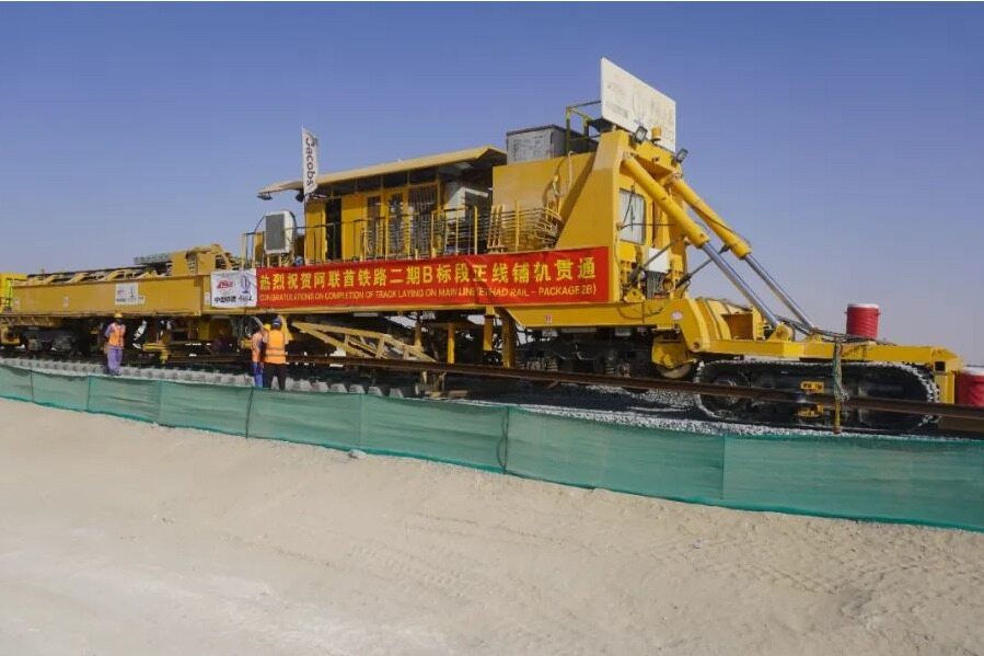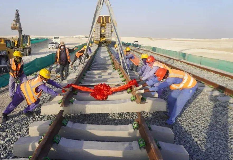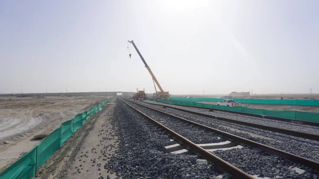 2022年3月16日,在中国土木阿联酋铁路二期项目B标段GMC57+750公里处,随着吊车将连接轨排徐徐放下,B、C标段451公里主线双向铺轨全部完成,实现了阿布扎比至迪拜铁路“双线连接”。