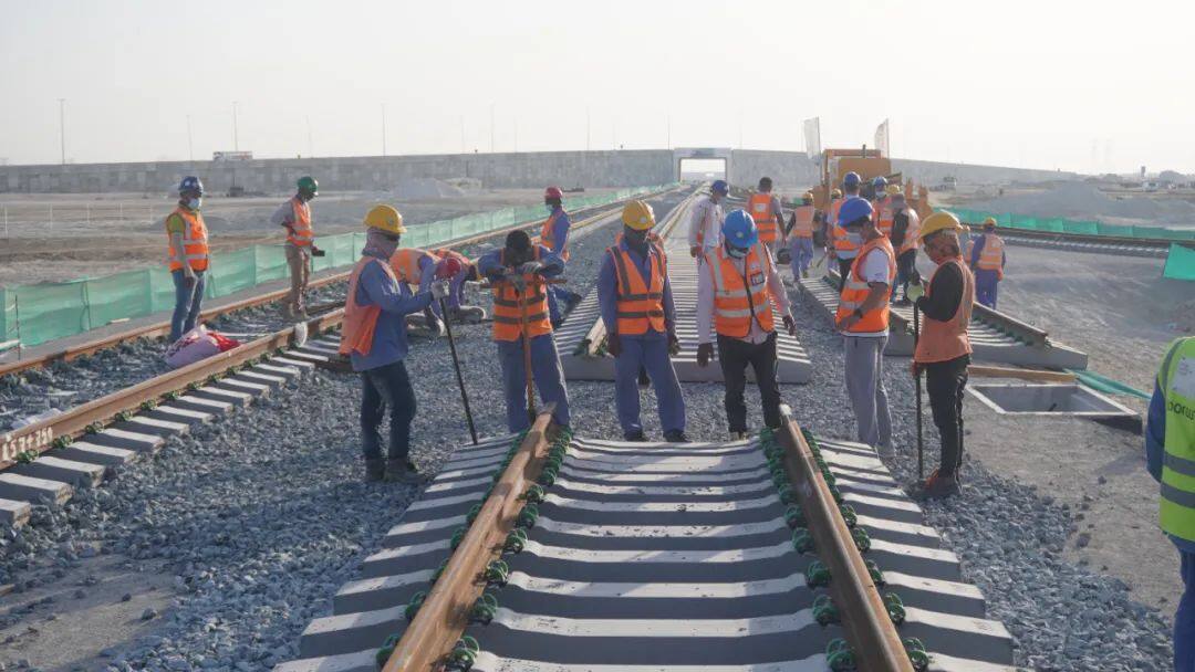 阿联酋铁路二期项目B、C标段地形、地质条件复杂,穿越广袤沙漠、戈壁,以及多个阿联酋国家重地。自2021年4月30日项目开始正式铺轨以来,历时11个月,轨道项目部自行生产的88万根轨枕、1940根400米长的钢轨,随着铺轨机的行进,一根根铺设在预设轨道上。铺轨穿越了沙漠、戈壁、国家重地等多重障碍,跨越了桥梁、涵洞等近300座结构物,安装了59组道碴,实现了长轨焊接415.76公里,“双线连接”了阿布扎比和迪拜。
