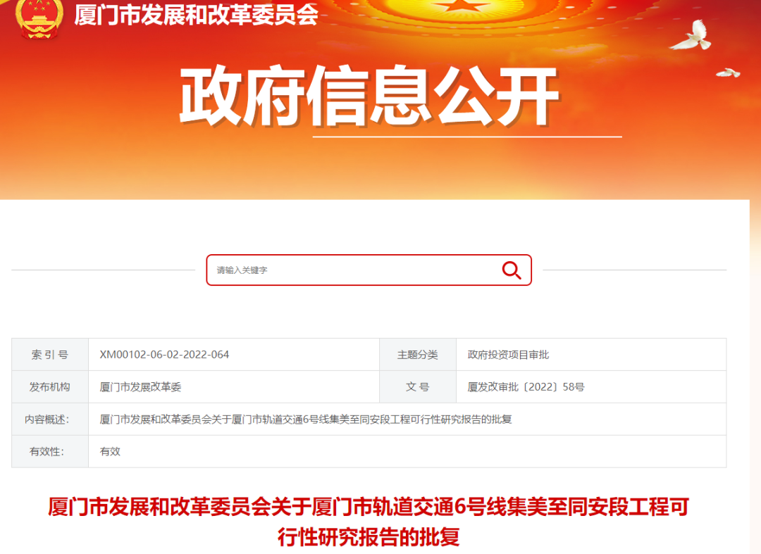On March 22, 2022, the Xiamen Municipal Development and Reform Commission announced the "Xiamen Municipal Development and Reform Commission's Reply to the Feasibility Study Report on the Jimei-Tong'an Section of Xiamen Rail Transit Line 6". Subsequent Xiamen Metro Line 6 project (Phase 1 of Line 9) can be fully started after obtaining land use approval, construction project permit and other relevant procedures.