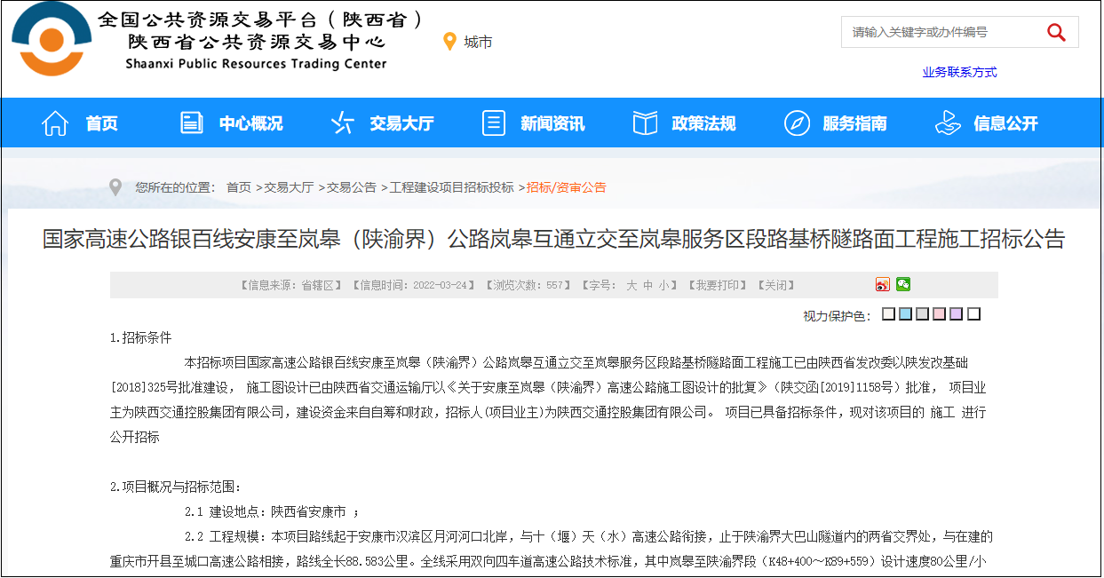 2022年3月24日,陕西省公共资源交易中心发布国家高速公路银百线安康至岚皋(陕渝界)公路岚皋互通立交至岚皋服务区段路基桥隧路面工程施工招标公告,所属行业公路,招标人陕西交通控股集团有限公司,项目总投资156.8亿元。