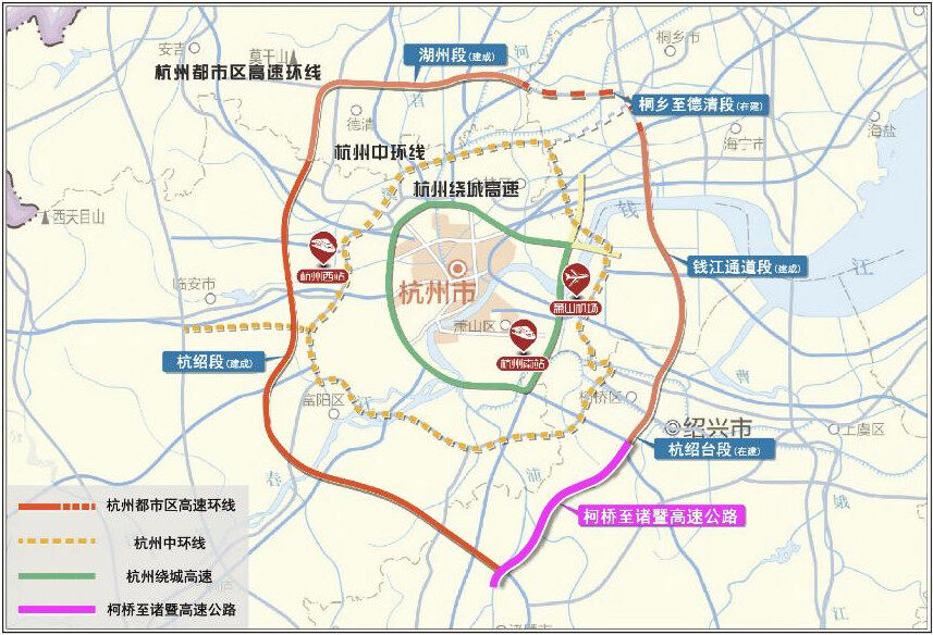 杭州二绕,即杭州都市区环线高速公路,全长约272公里,由杭州绕城高速公路西复线(杭州至绍兴段、湖州段)、苏台高速公路桐乡段及桐乡至德清联络线、钱江通道及接线工程、杭绍台高速公路、柯诸高速公路、诸永高速公路等7个项目围合而成,目前已通车约197公里。