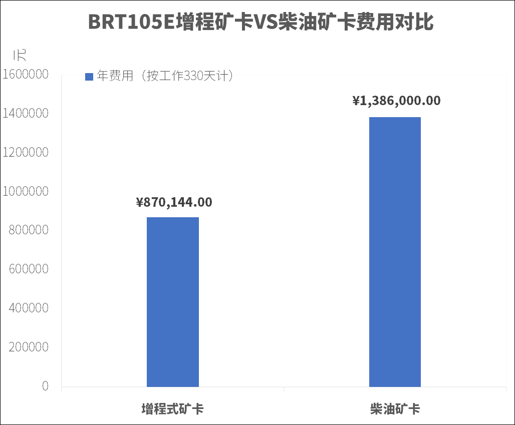 在博雷顿测试矿场,工程师们进行了多轮测试,得到了详实的数据。测试现场为满载上坡工作场景,每趟行驶距离约5km,每天运营30趟。在这种场景下,每台博雷顿BRT105E增程式矿卡每年可比同级柴油车型节约油费约51.5万元。
