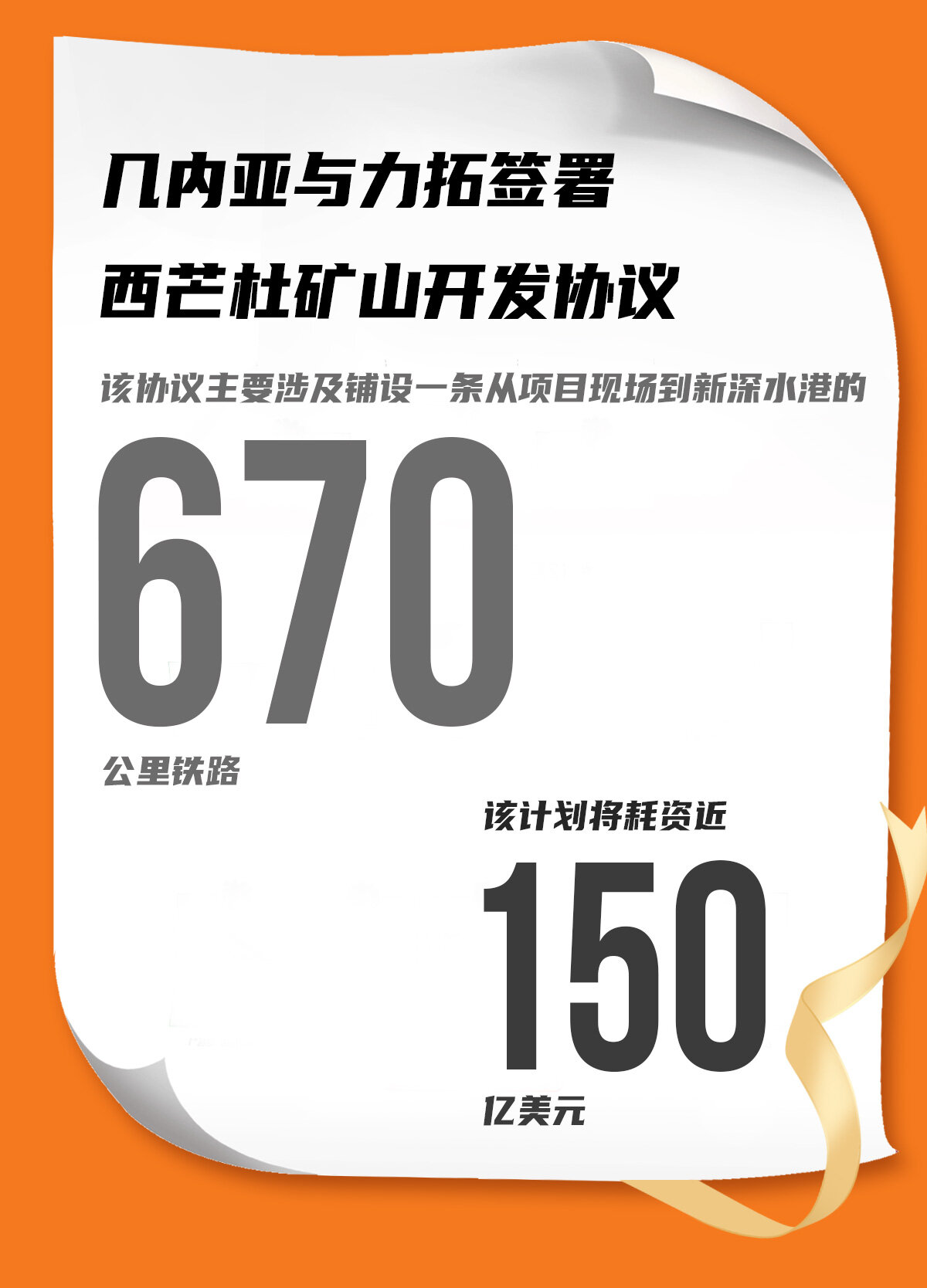 该协议主要涉及铺设一条从项目现场到新深水港的670公里铁路。Magassouba表示,该计划将耗资近150亿美元。国家电视台的部长表示,政府与项目参与者力拓、中国铝业公司(中铝)和中国支持的SMB-Winning财团签署了框架协议。