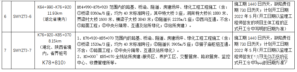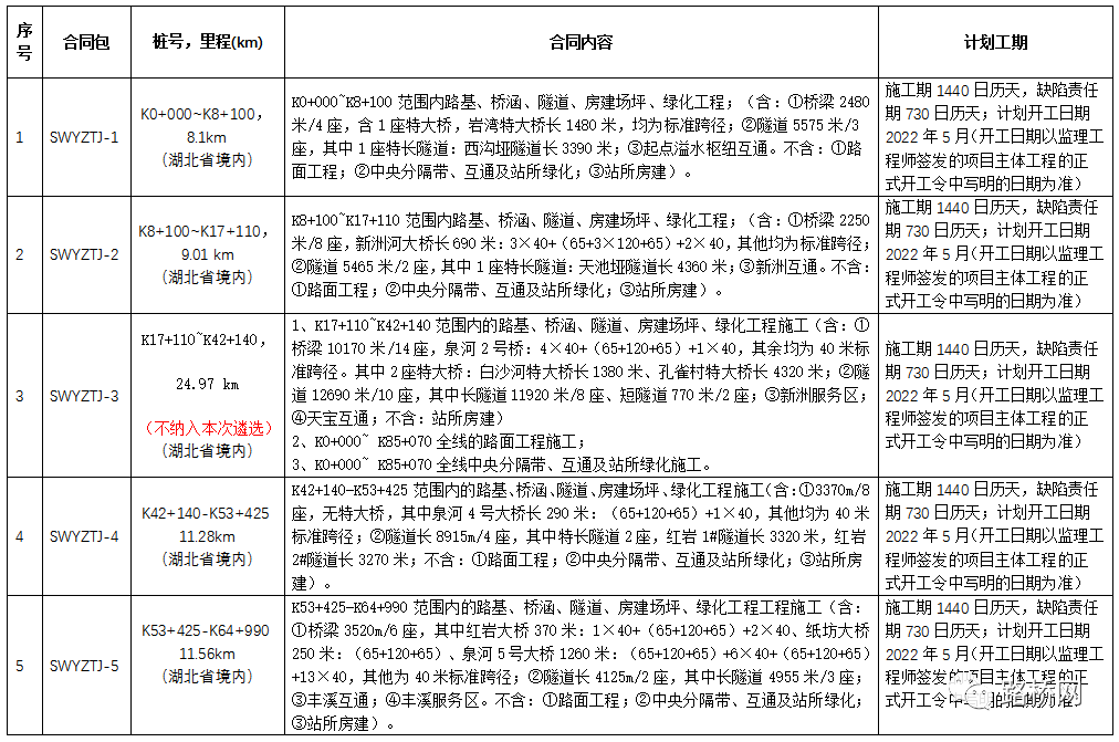 具体标段划分、计划工期等见下表。对其中的SWYZTJ-1标段、SWYZTJ-2标段、SWYZTJ-4标段、SWYZTJ-5标段、SWYZTJ-6标段、SWYZTJ-7标段进行公开遴选。