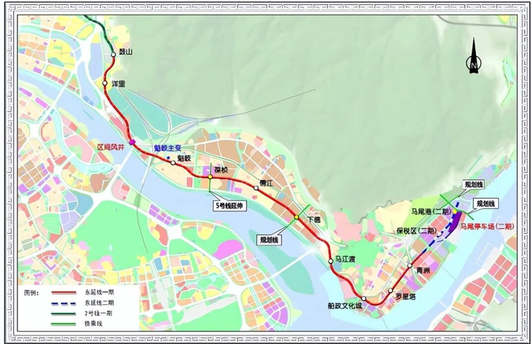 福州市轨道交通2号线东延线一期工程线路起于鼓山站(不含),终于青洲站,全长14.6公里,全线共设车站9座,其中换乘站2座;新建110kV主变电所1座;与轨道交通2号线共用停车场、车辆段和控制中心。初步设计概算总额121.14亿元。