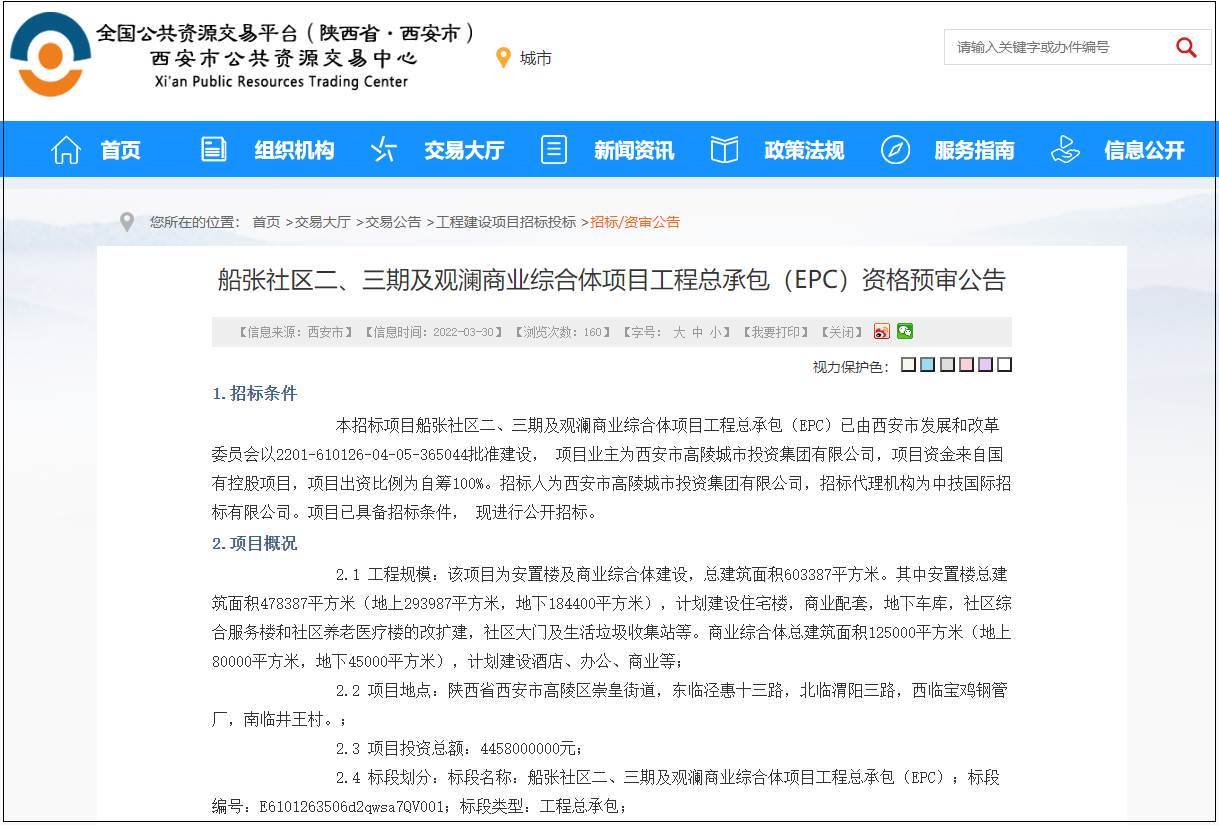 On March 30, 2022, Xi'an Public Resource Trading Center released the pre-qualification announcement for the general contracting (EPC) of Xi'an Chuanzhang Community Phase II and Phase III and Guanlan Commercial Complex Project. Group Co., Ltd., with a total project investment of 4.458 billion yuan.