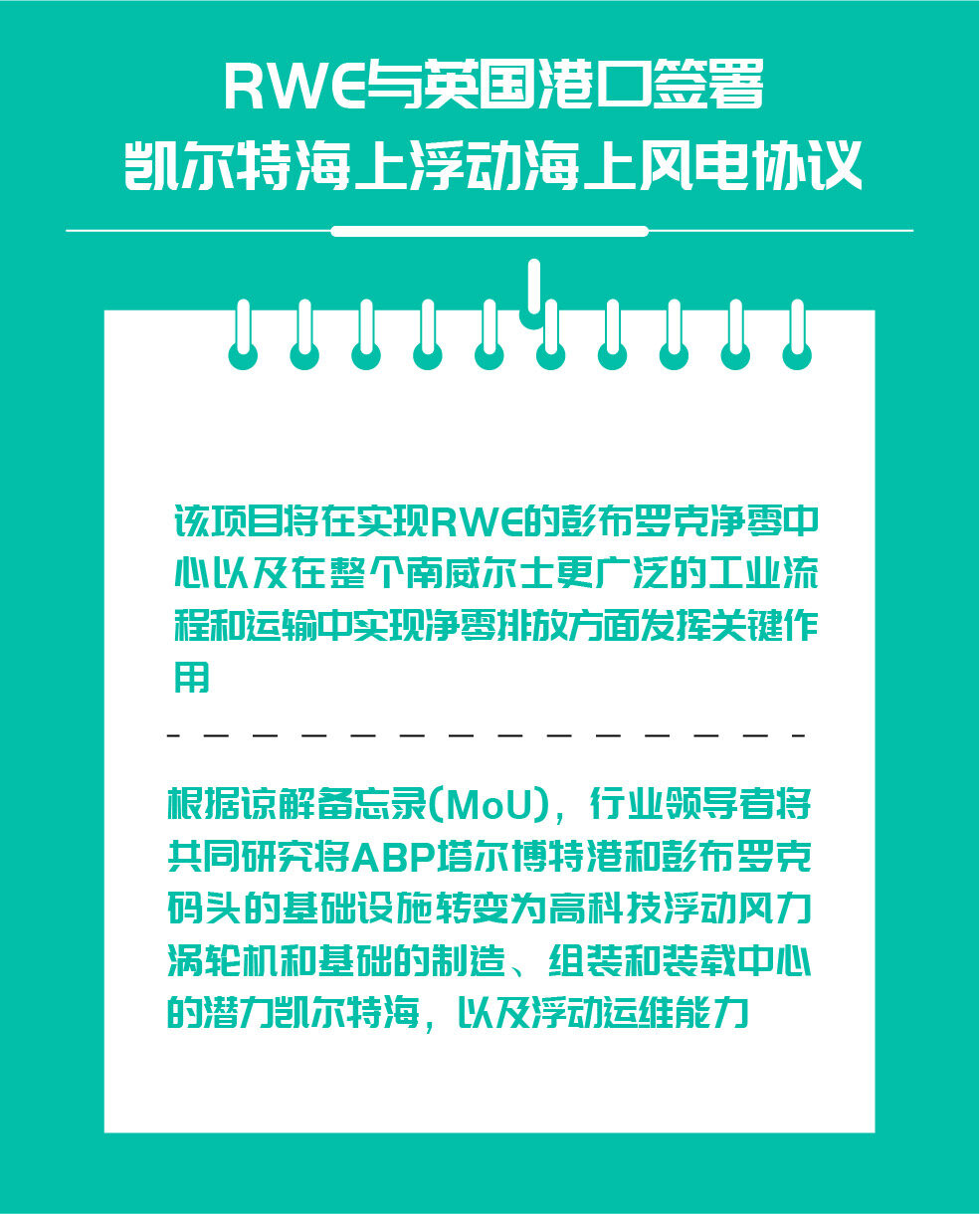 这将包括对港口能力和准备支持浮动海上风电项目的发展进行技术评估、可行性研究和经济影响研究,以最大限度地提高就业、技能和长期未来投资方面的利益。“与RWE签署的这份谅解备忘录标志着朝着实现南威尔士浮动海上风电(FLOW)潜力迈出的重要一步。ABP在威尔士的港口一直是威尔士工业中心地带的重要组成部分,而塔尔博特港正是凯尔特海为区域经济带来革命性变化并使英国更接近净零排放的机会的核心,”Henrik Pedersen,联合首席执行官英国港口说。“我们对南威尔士FLOW的未来感到非常兴奋。发展港口至关重要它是整个凯尔特海雄心的基础。”关键词:工程施工、工程新闻