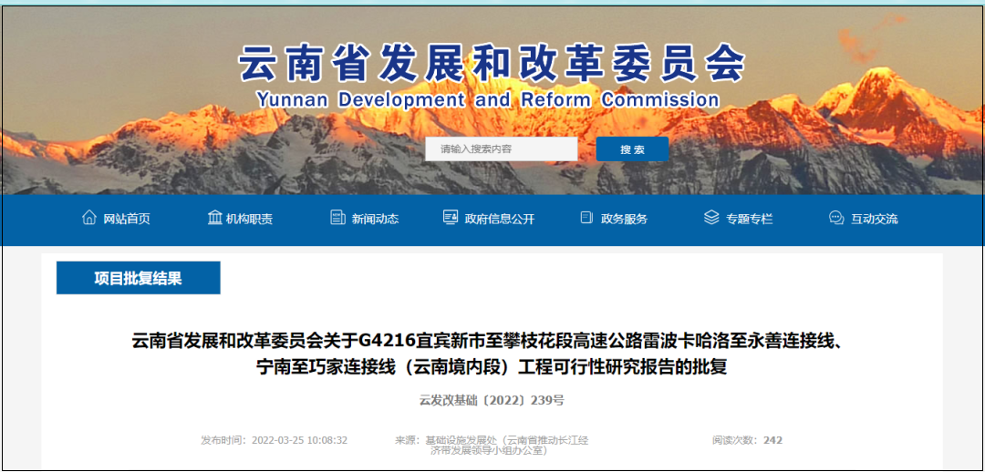 自2022年开年以来,云南发改委陆续批复了8条公路,除了以上4条,还有昌宁至链子桥高速公路工程、G85银昆高速公路寻甸(功山)至嵩明(小铺)段改扩建工程、西畴至富宁高速公路工程、国道G219线云南景洪(勐宽)至勐腊(勐醒)段改扩建工程,总投资约528亿元。具体详情如下: