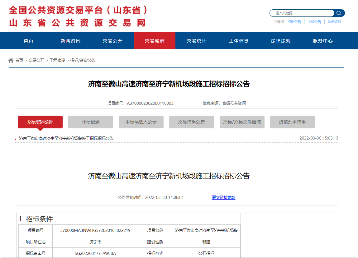 في 30 مارس 2022 ، أصدرت شبكة تجارة الموارد العامة لمقاطعة شاندونغ الإعلان عن مناقصة بناء طريق جينان-ويشان السريع من جينان إلى قسم مطار جينينغ الجديد ، وفترة البناء المخطط لها هي 1096 يومًا.