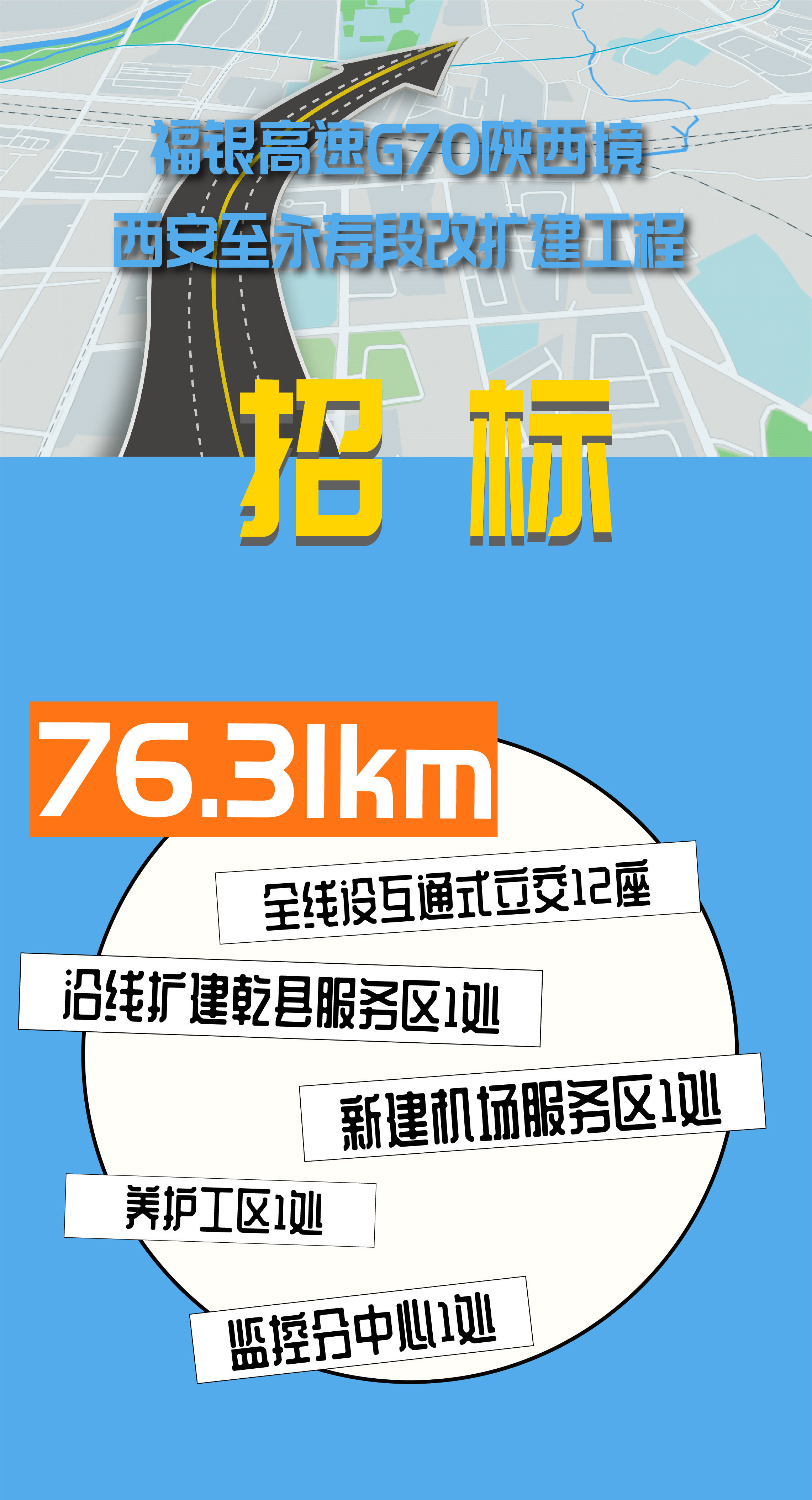 建设地点西安市、咸阳市;路线沿既有福银高速扩建,起点位于六村堡收费站,终点位于永寿南立交,改扩建路线全长79.31公里,估算投资137.808亿元。全线设特大桥3314.08米/1座,大桥3470.83米/8座,中桥1584.18米/29座,小桥177.77米/9座,桥梁全长8546.76米,占路线长度的11.15%;全线设互通式立交12座,其中改建六村堡(枢纽)、咸阳东、机场西、咸阳北(枢纽)、马庄西(枢纽)、西张堡、礼泉、乾县北、乾陵、永寿南10座,新建沣泾立交、咸阳经开立交;设服务区共2处(扩建乾县服务区1处,新建机场服务区1处);设养护工区1处,监控分中心1处。起点至乾县东枢纽立交段48.5公里采用设计速度120公里/小时、路基宽53米的十车道高速公路标准;乾县东枢纽立交至永寿段30.81公里采用设计速度120公里/小时、路基宽42米的八车道高速公路标准;其它技术指标按照现行《公路工程技术标准》(JTGB01-2014)规定执行。计划工期XY-SJ段360天;XY-ZX段360天。