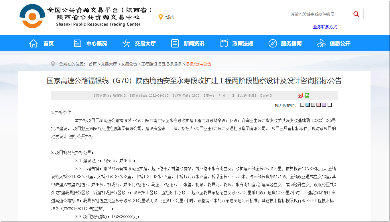 2022年4月1日,陕西省公共资源交易中心发布国家高速公路福银线(G70)陕西境西安至永寿段改扩建工程两阶段勘察设计及设计咨询招标公告,所属行业公路,招标人陕西交通控股集团有限公司,项目总投资137.8亿元。