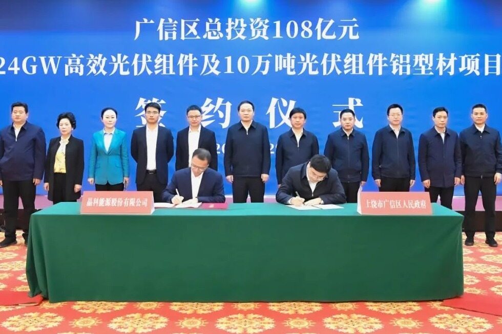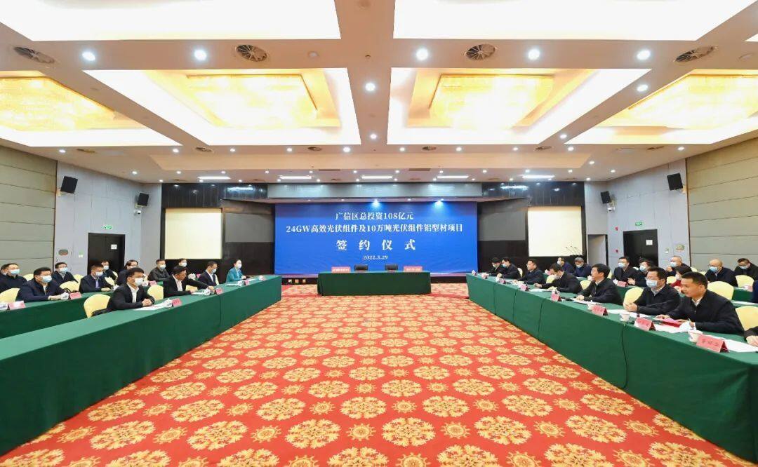 2022年3月29日,总投资108亿元的24GW高效光伏组件及10万吨光伏组件铝型材项目在上饶市广信区正式签约。这是晶科能源控股有限公司2022年在上饶落地的第二个过百亿项目。