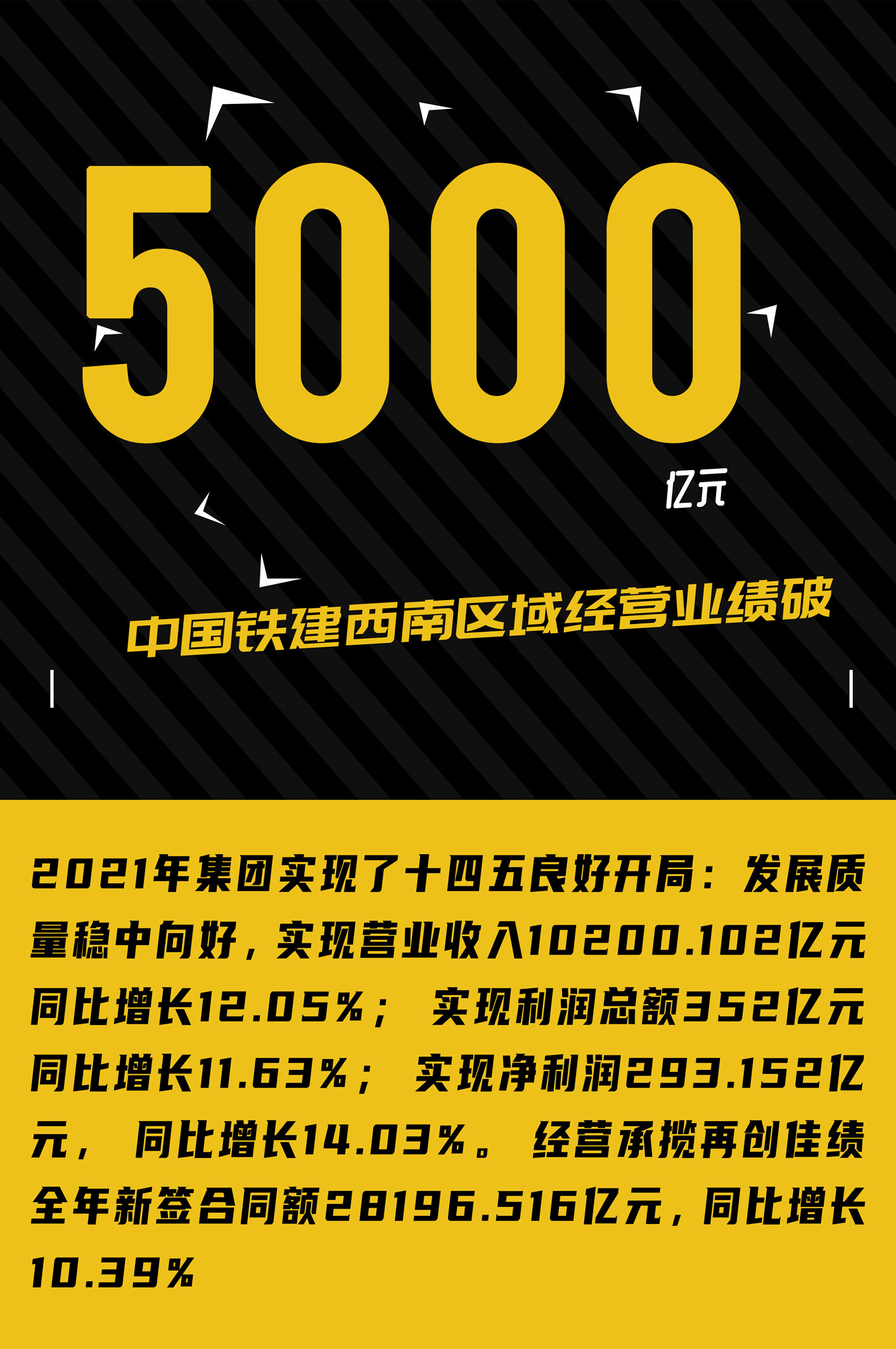 日前,中国铁建集团发布了其2021年企业年报,根据公告显示,2021年集团实现了“十四五”良好开局:发展质量稳中向好,实现营业收入10200.102亿元,同比增长12.05%;实现利润总额352亿元,同比增长11.63%;实现净利润293.152亿元,同比增长14.03%。经营承揽再创佳绩,全年新签合同额28196.516亿元,同比增长10.39%。中国铁建也由此一跃进入营收和新签合同额“双万亿”央企俱乐部。