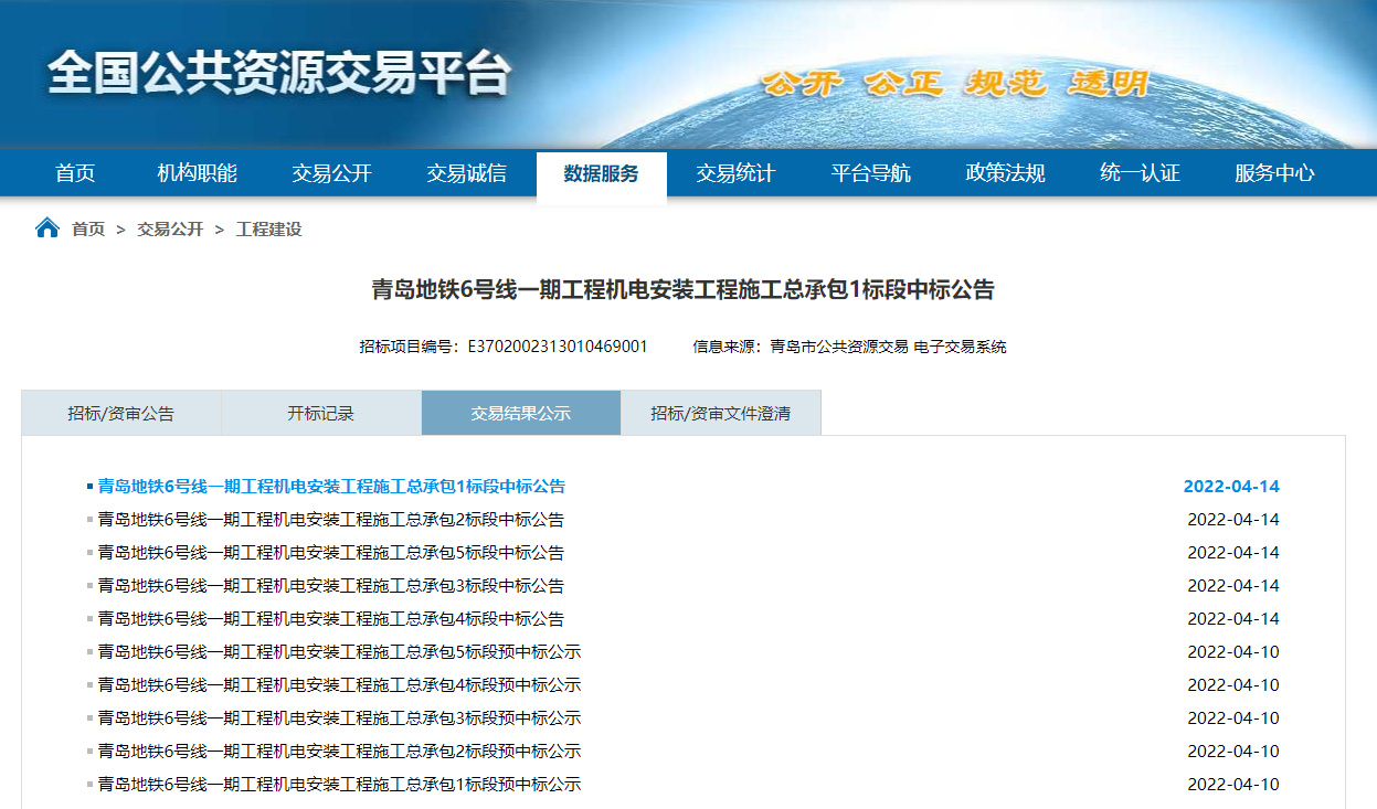 2022年4月14日,全国公共资源交易中心发布青岛地铁6号线一期工程机电安装工程施工总承包中标公告,中铁二局、中建三局、中铁隧道集团、中铁四局、中铁六局中标山东地铁大单!