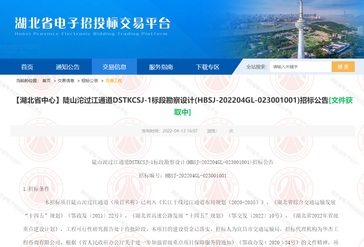 2022年4月13日,湖北省电子招投标交易平台发布陡山沱过江通道DSTKCSJ-1标段勘察设计招标公告,所属行业公路,招标人宜昌市交通运输局,项目总投资162.2亿元。