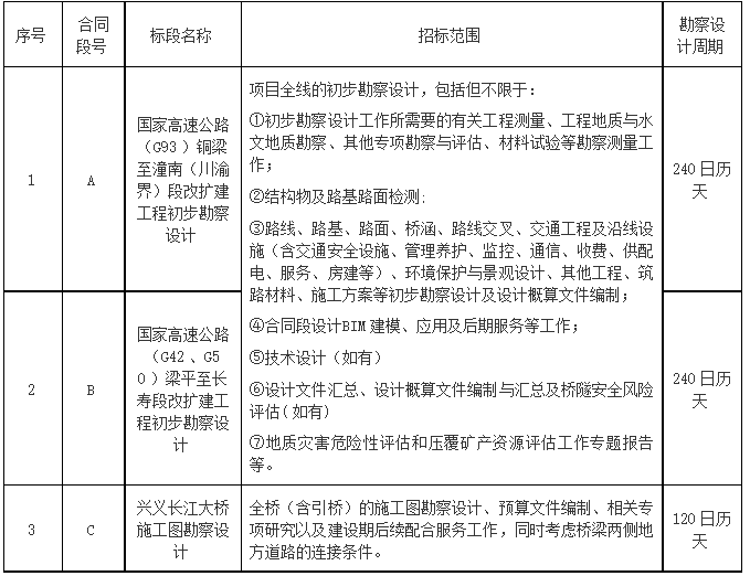 本次招标分为3个合同段,合同段划分、招标范围及勘察设计周期如下表: