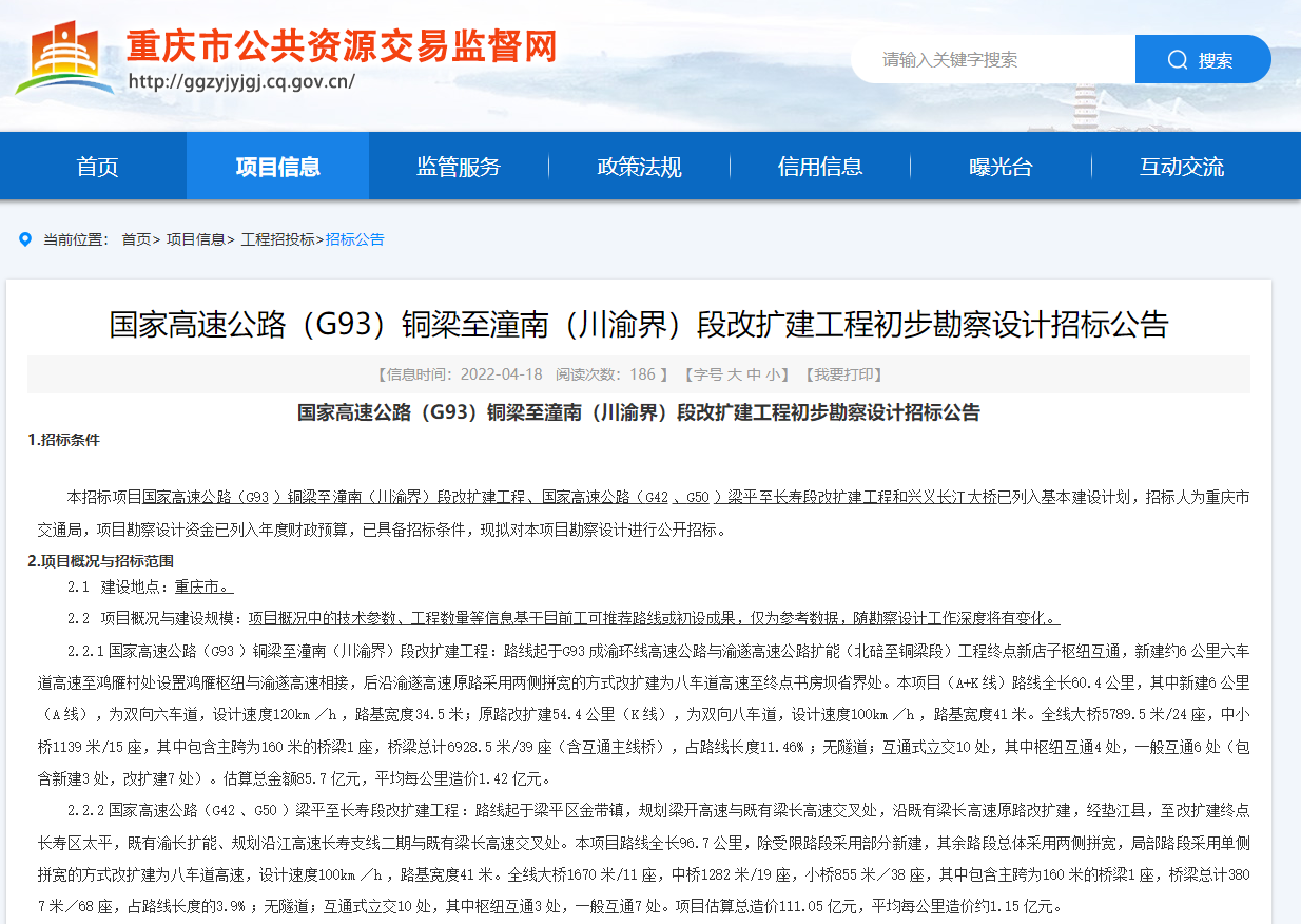 2022年4月18日,重庆市公共资源交易监管网发布国家高速公路(G93)铜梁至潼南(川渝界)段改扩建工程初步勘察设计招标公告,所属行业公路,招标人重庆市交通局,项目估算总金额85.7亿元。