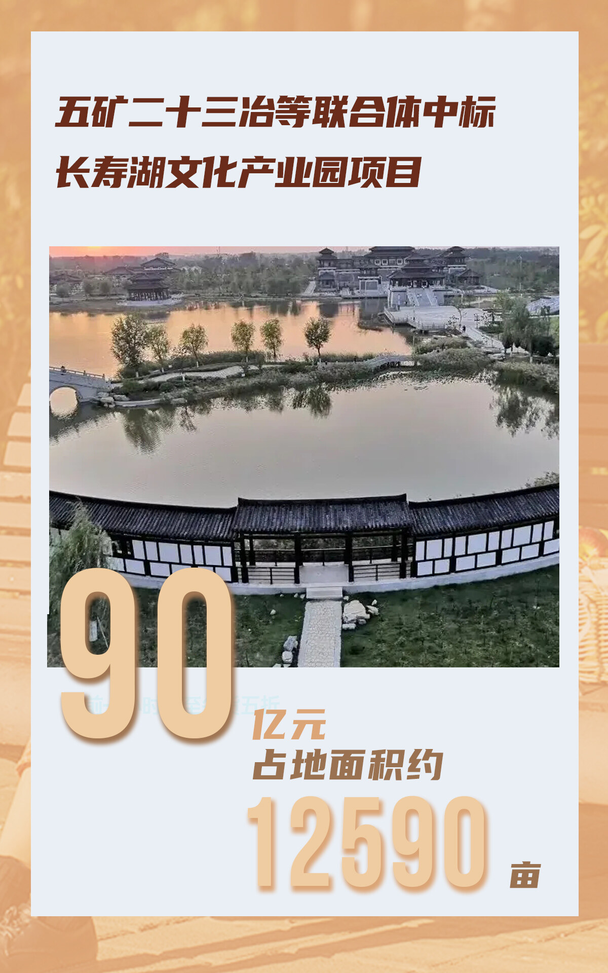 2022年4月20日,重庆大司空信息科技有限公司发布长寿湖文化产业园(投资人+EPC)中标公示,项目总投资约90亿元,五矿二十三冶建设集团有限公司、五矿国际信托有限公司、天津市政工程设计研究总院有限公司、天津城建设计院有限公司四家单位中标。