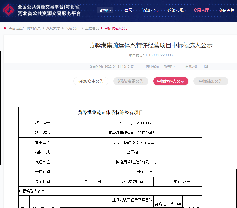 On April 21, 2022, the Hebei Provincial Public Resources Trading Service Platform released the announcement of the winning candidates for the franchise project of the Huanghua Port Collection and Distribution System.