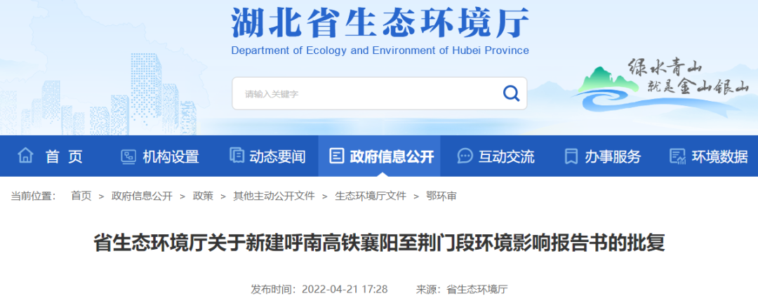2022年4月20日,湖北省生态环境厅对新建呼南高铁襄阳至荆门段环境影响报告书进行了批复。据悉,该项目离正式开工又进了一步。