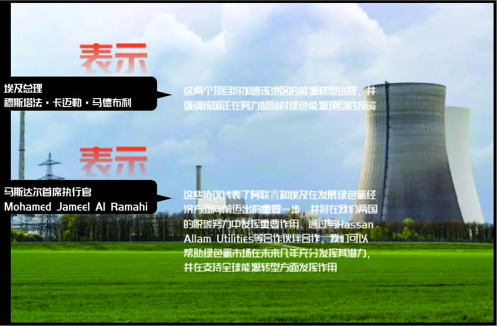 埃及总理穆斯塔法·卡迈勒·马德布利表示,这两个项目将加速该地区的能源转型进程,并强调该国正在努力鼓励对绿色能源项目的投资。马斯达尔首席执行官Mohamed Jameel Al Ramahi表示:“这些协议代表了阿联酋和埃及在发展绿色氢经济方面向前迈出的重要一步,并将在我们两国的脱碳努力中发挥重要作用。通过与Hassan Allam Utilities等合作伙伴合作,我们可以帮助绿色氢市场在未来几年充分发挥其潜力,并在支持全球能源转型方面发挥作用。”