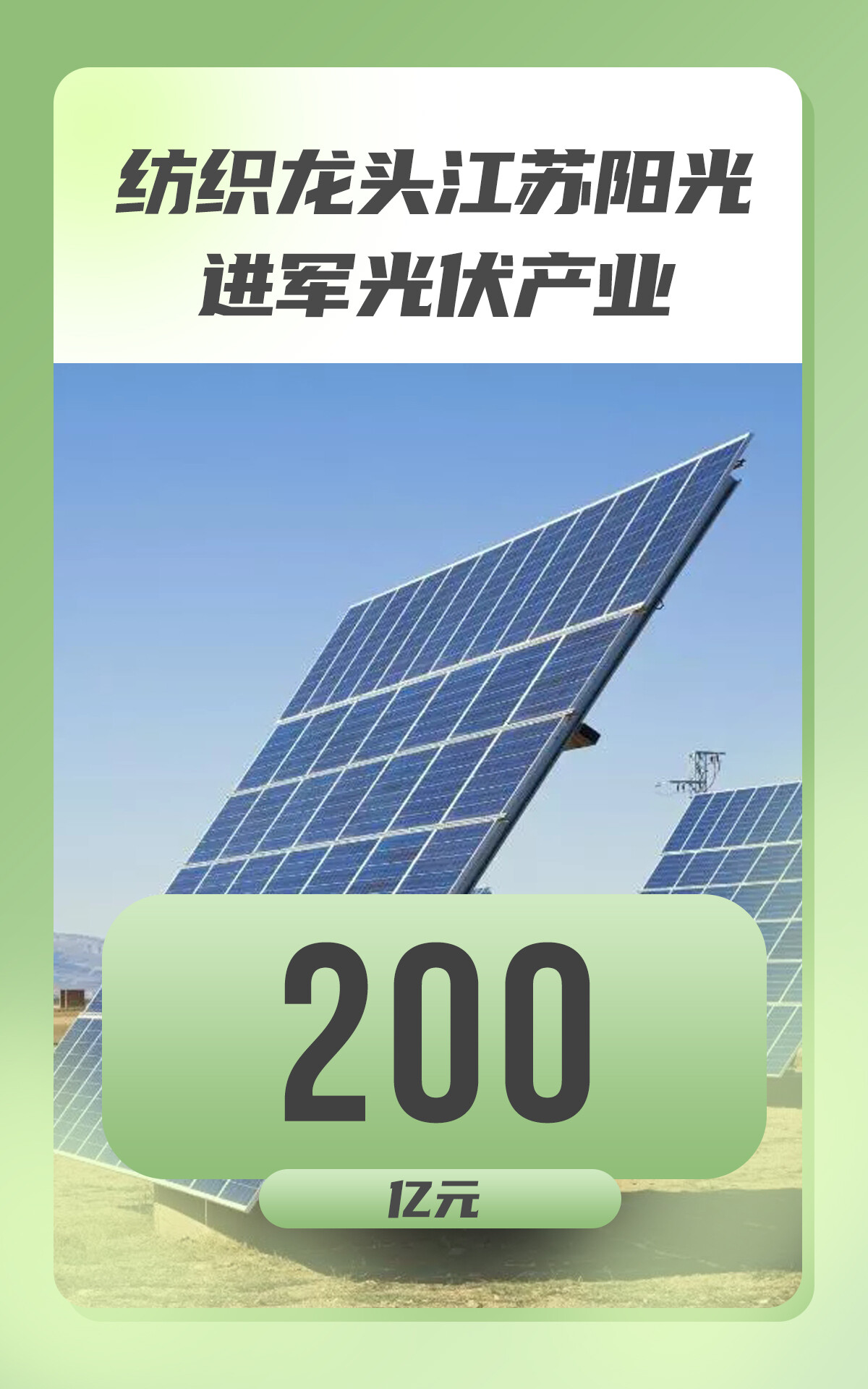 2022年4月22日,纺织业龙头江苏阳光披露,将在包头市九原工业园区建设10万吨多晶硅、10 GW单晶拉棒(包括切片)、10 GW电池片及组件项目,同时建设10 GW光伏电站项目,项目投资不含电站约为200亿元。