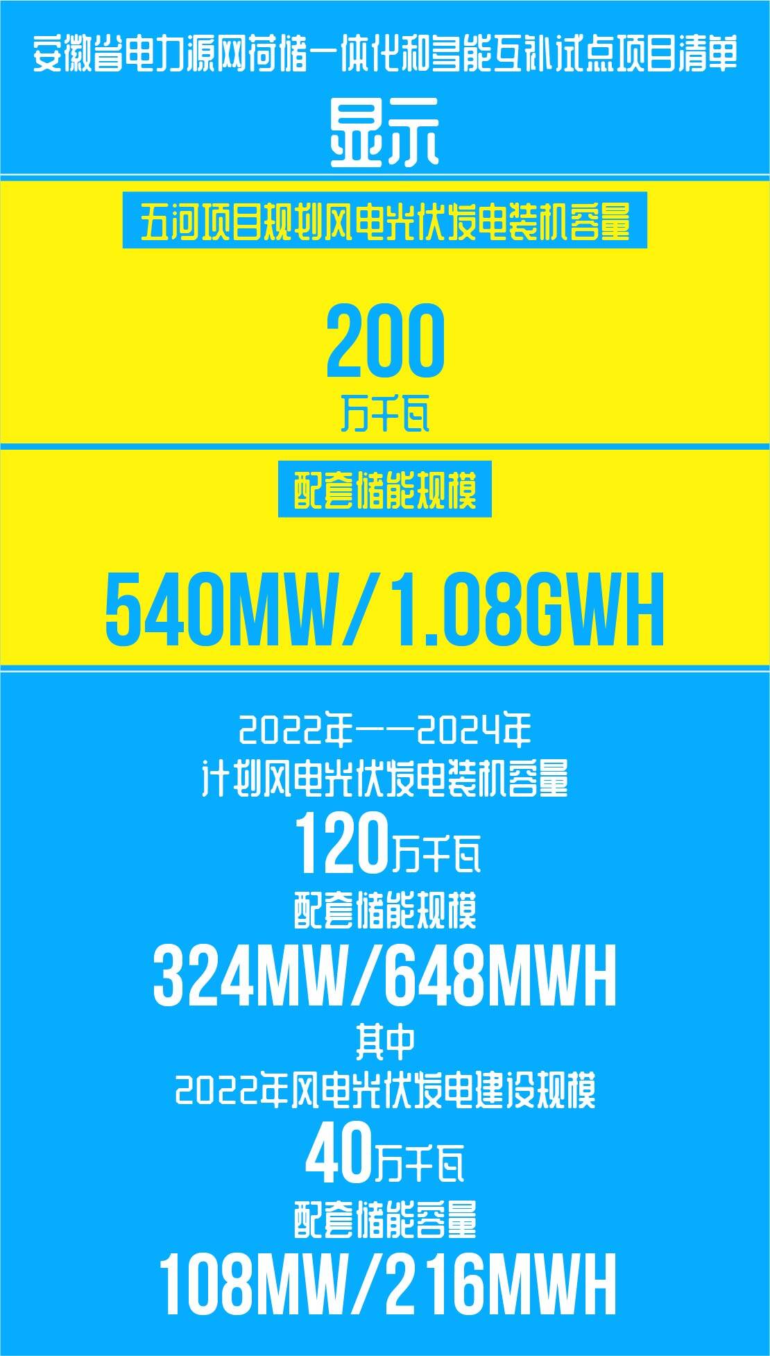 据显示,五河项目规划风电光伏发电装机容量200万千瓦,配套储能规模540MW/1.08GWh,2022年至2024年计划风电光伏发电装机容量120万千瓦,配套储能规模324MW/648MWh。其中,2022年风电光伏发电建设规模40万千瓦,配套储能容量108MW/216MWh。