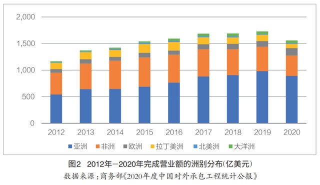 从中国对外承包工程企业完成营业额的洲别分布来看,亚洲国家无疑是最主要的收入来源地。而且,从2012年到2020年,亚洲的收入贡献率从46.6%逐渐上升至57.2%,成为超过半数中国对外承包企业的业务来源。与此同时,非洲的贡献呈现下降态势,从2012年的35.0%逐步降至2020年的24.6%。亚非两大洲,在2020年合计贡献了81.8%的营业额,占比超过五分之四。虽然缺乏2021年的具体数据,但亚非占优的市场结构可能不会发生较大的改变。2022年亚非的表现如何,可能会决定中国对外承包工程全行业的基本发展状态。