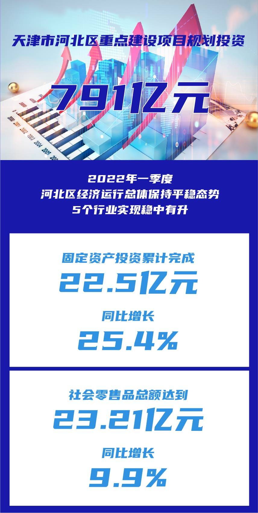 2022年经济稳字当头,重大项目建设,具有战略性、基础性和先导性作用,4月27日,记者从天津市人民政府新闻办公室举行的发布会获悉,2022年一季度,河北区经济运行总体保持平稳态势,5个行业实现稳中有升。固定资产投资累计完成22.5亿元,同比增长25.4%;社会零售品总额达到23.21亿元,同比增长9.9%。