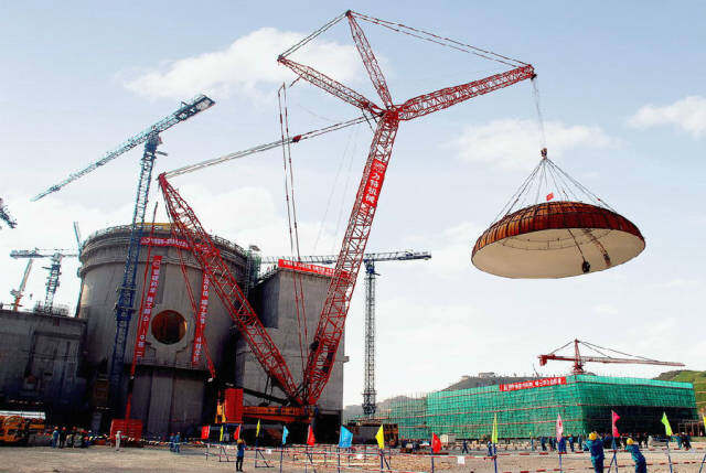 在核电建设中,三一也是最早的自主开拓品牌。2009年,三一SCC9000完成福建宁德核电站1号机组核岛穹顶吊装,这是世界首次采用中国生产的履带起重机进行核电建设关重部件吊装作业。