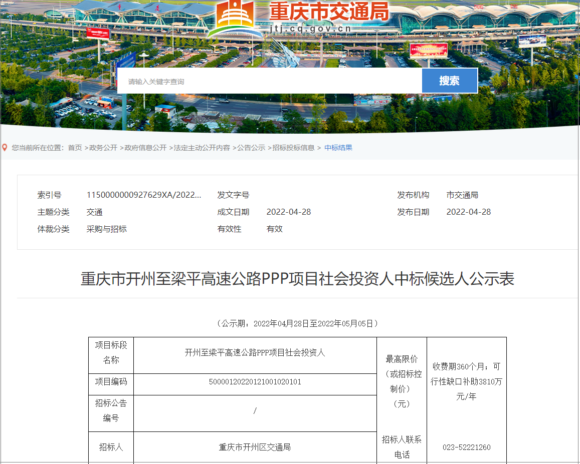 2022年4月28日,重庆市交通局发布重庆市开州至梁平高速公路PPP项目社会投资人中标候选人公示表,行业交通,重庆高速等联合体中标,项目总投资约为132.57亿元。