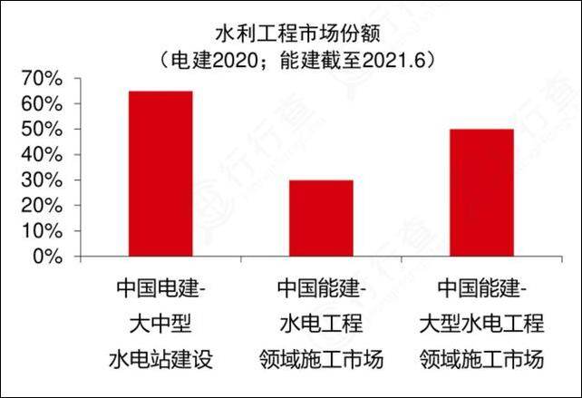 在水利工程领域,中国电建2020年在大中型水电站建设市场份额超过65%,中国能建截至2021年6月在水电工程领域施工市场份额超过30%,在大型水电工程领域施工市场份额超过50%。