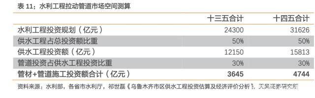 天风证券测算“十四五”期间由水利工程所带来的管道市场规模有望达4744亿元,比“十三五”多出近1100亿元。