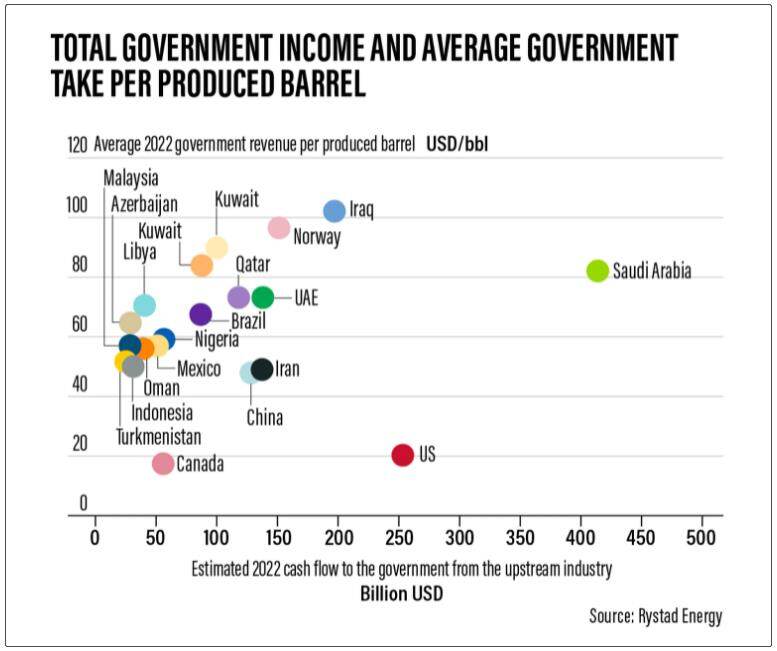 Rystad说,伊拉克政府每桶的收入最高,该国每生产一桶石油,政府大约需要100美元。挪威是全球第10大石油和天然气生产国,由于欧洲天然气价格上涨、成本低廉以及政府在石油和天然气行业拥有大量所有权,2022年将获得约1500亿美元的收益。该国每桶生产的政府收入也非常高,略低于100美元,而美国则处于规模的另一端,由于投资率高、国内天然气价格低,政府每桶生产的平均收入约为20美元价格和低公司税率。(转载请注明见道网www.seetao.com)见道网工程栏目编辑/邢文涛