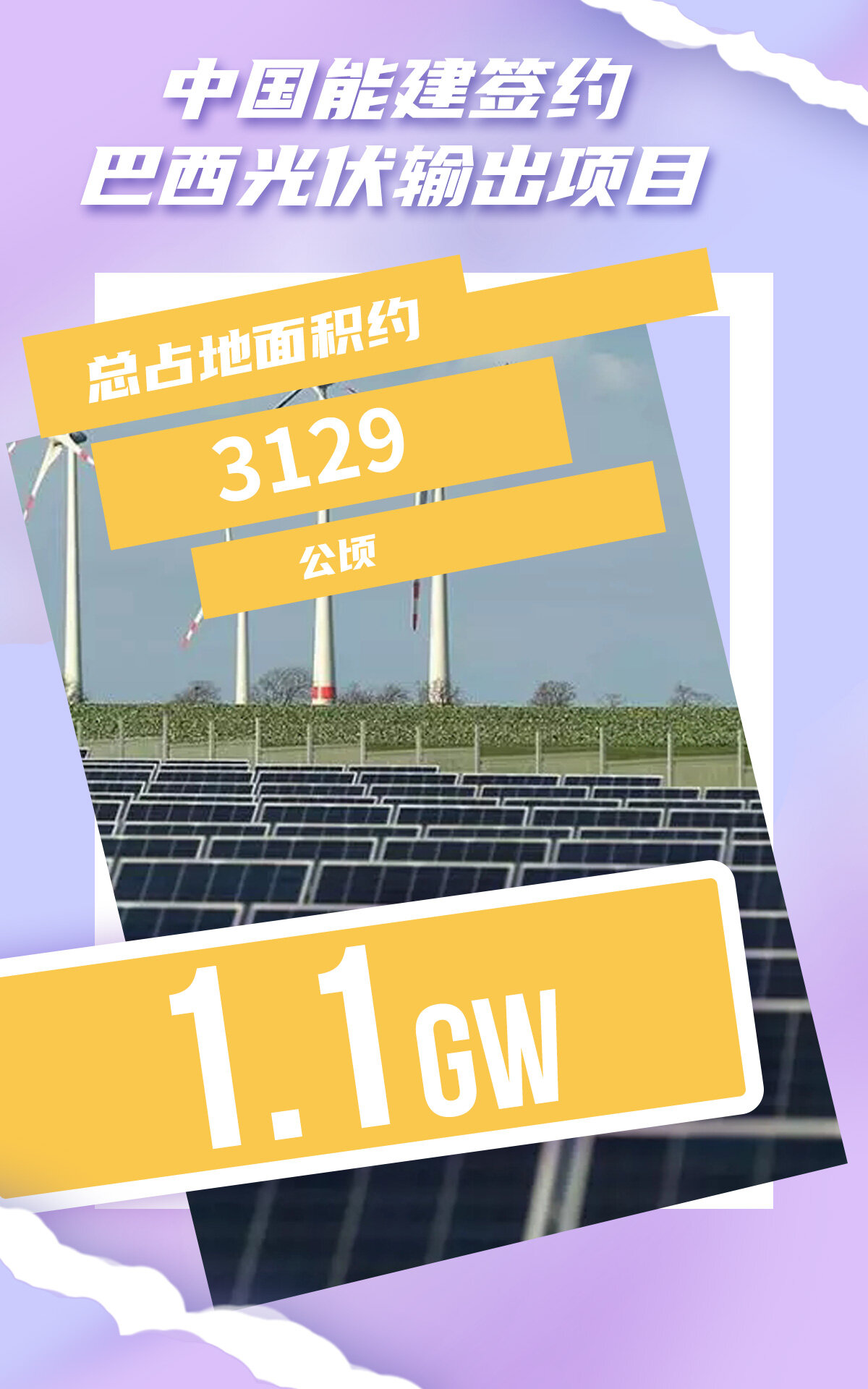 2022年4月27日,中国能建中电工程国际公司与EAB新能源公司、巴西能源项目投资公司举行了巴西光伏项目EPC合作协议签约仪式。这是公司重组以来在新能源领域的又一突破,实现了中电工程在巴西市场的滚动发展。