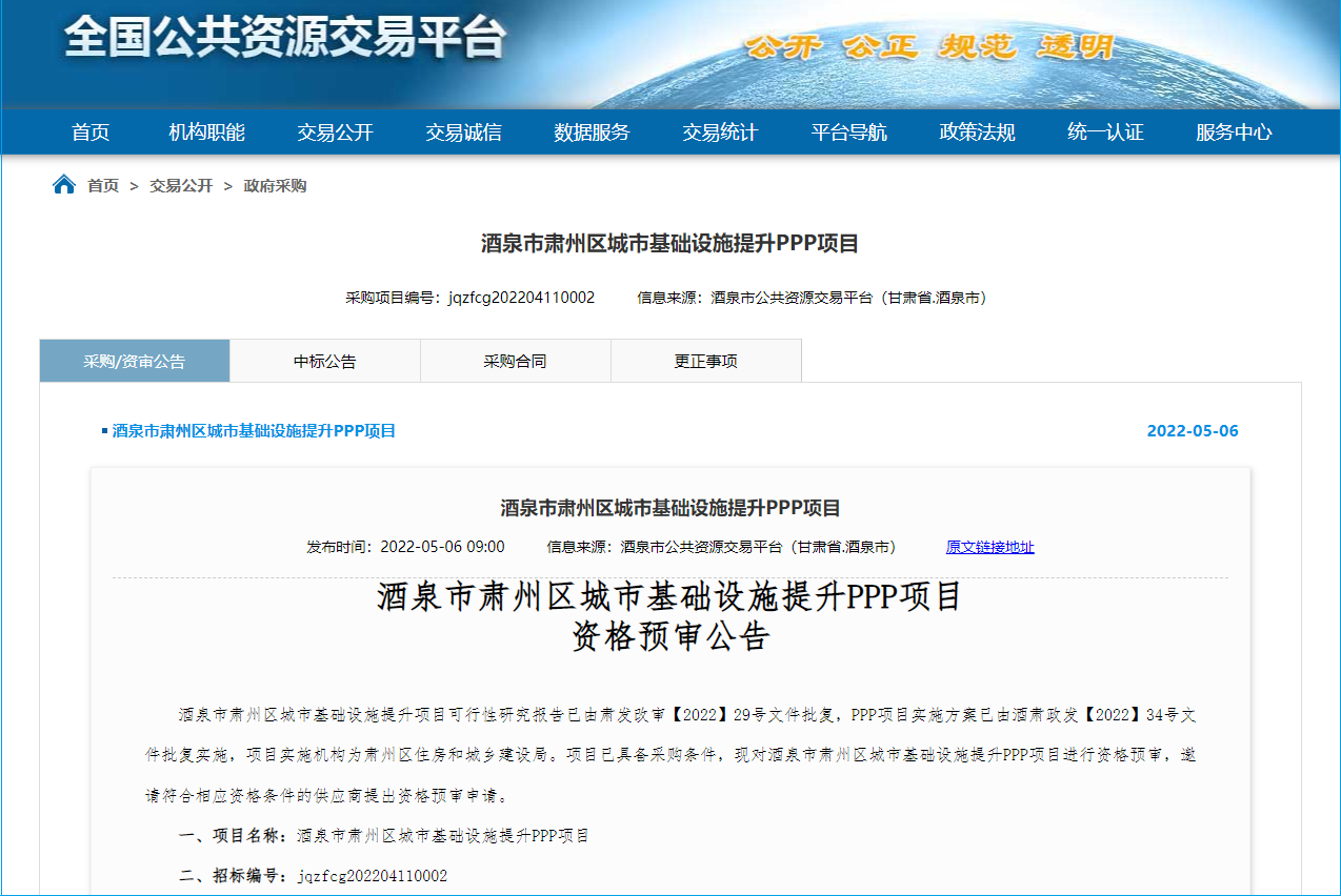 On May 6, 2022, the National Public Resource Trading Platform issued a pre-qualification announcement for the urban infrastructure improvement PPP project in Suzhou District, Jiuquan City. .
