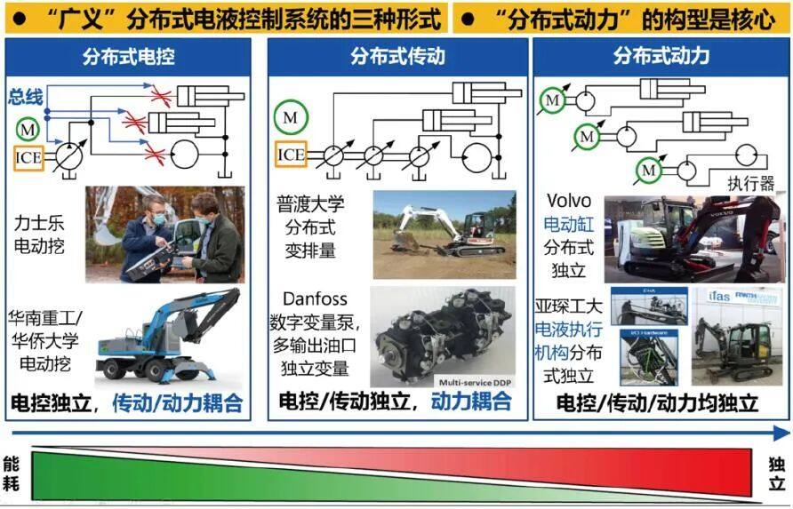 为什么说电动化中分布式的动力机构这么重要?主要还是因为工程机械具有一个非常重要的特点,它是单动力源多执行机构,就是只有一个泵源,但有一大堆的执行器,这样的系统天生效率低,至今没有好办法。有一些好的技术方案都在实验室里,在市场上并没有得到应用。在电动化时代,“分布式驱动”取代“集中式驱动”成为可能,现在看来,分布式电液动力系统一定会成为未来机器的一个主要方向。