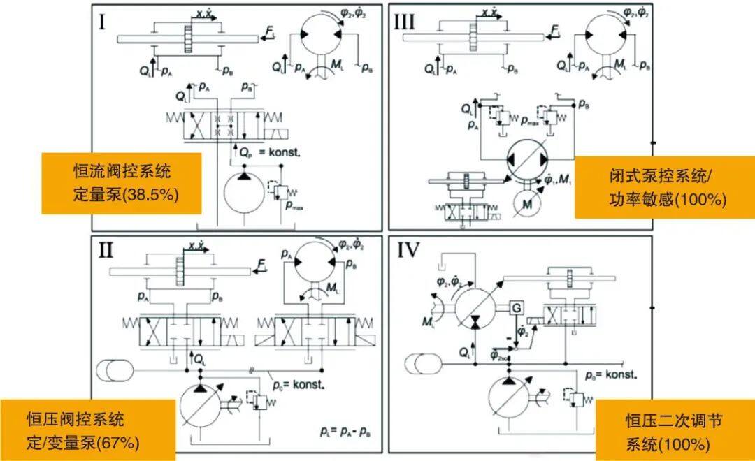我们举个例子,液压传动系统大概分为四大类(见图3)。其中闭式泵控系统效率最高,泵控系统电动机可以不调速,当然也可以调速。未来调速电机肯定是要取代不调速电机、变量泵这种系统,因为它有更多的优点。现在看来,电机调速的泵控系统一定会成为非道路移动机器未来的选择,因为考虑到分布式寄生损失的影响,它的效率要比现在的泵控系统高很多。