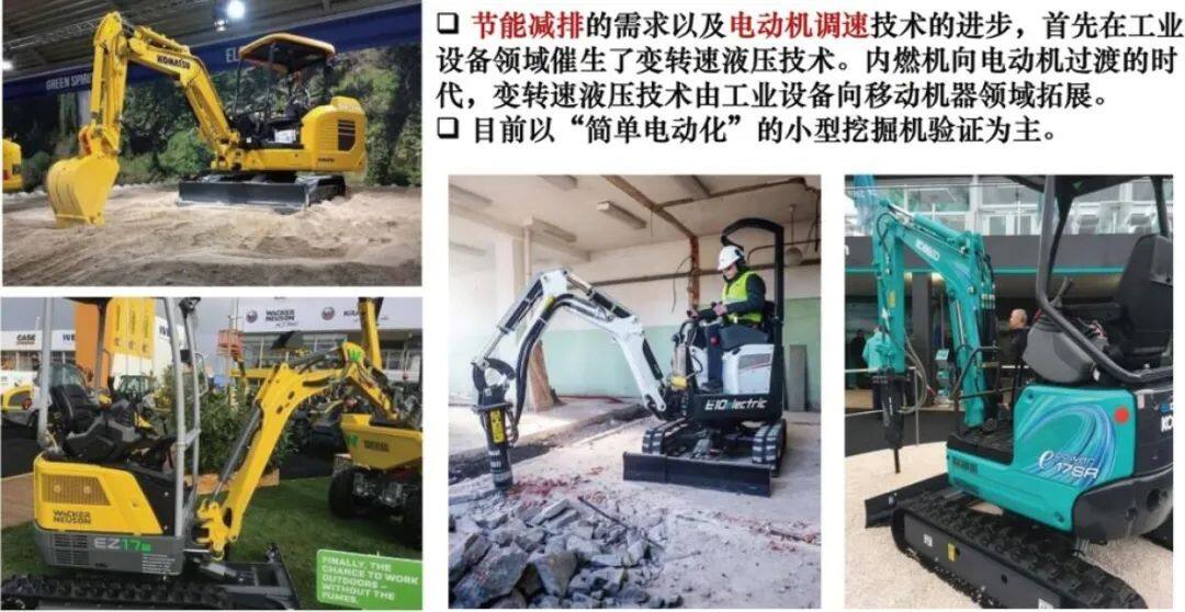 纯电动化时代对工业液压来讲意义不大,因为它本来用的就是电动机。今天我们讲的所谓“电动化时代的到来”,主要涉及的还是非道路移动机器(包括工程建设施工机械、农业机械、林业机械、工业车辆等)。非道路移动机器是液压产品最大的用户,也是液压技术发展最大的推动力,相比工业液压,移动液压产品的一些重要技术指标要求更高。目前国内外双碳政策与节能法规等加速了内燃机时代向电动机时代过渡的步伐。可以说未来非道路移动机器领域,以前在工业设备中所使用的液压技术,尤其是变转速的液压技术会成为主流。