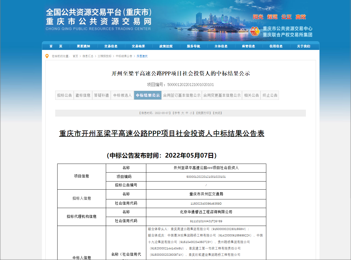 2022年5月7日,重庆市公共资源交易网发布开州至梁平高速公路PPP项目社会投资人的中标结果公示,该项目由重庆高速公路集团有限公司牵头,中国葛洲坝集团路桥工程有限公司等十一家单位组成的联合体中标,项目估算总投资约为132.57亿元。