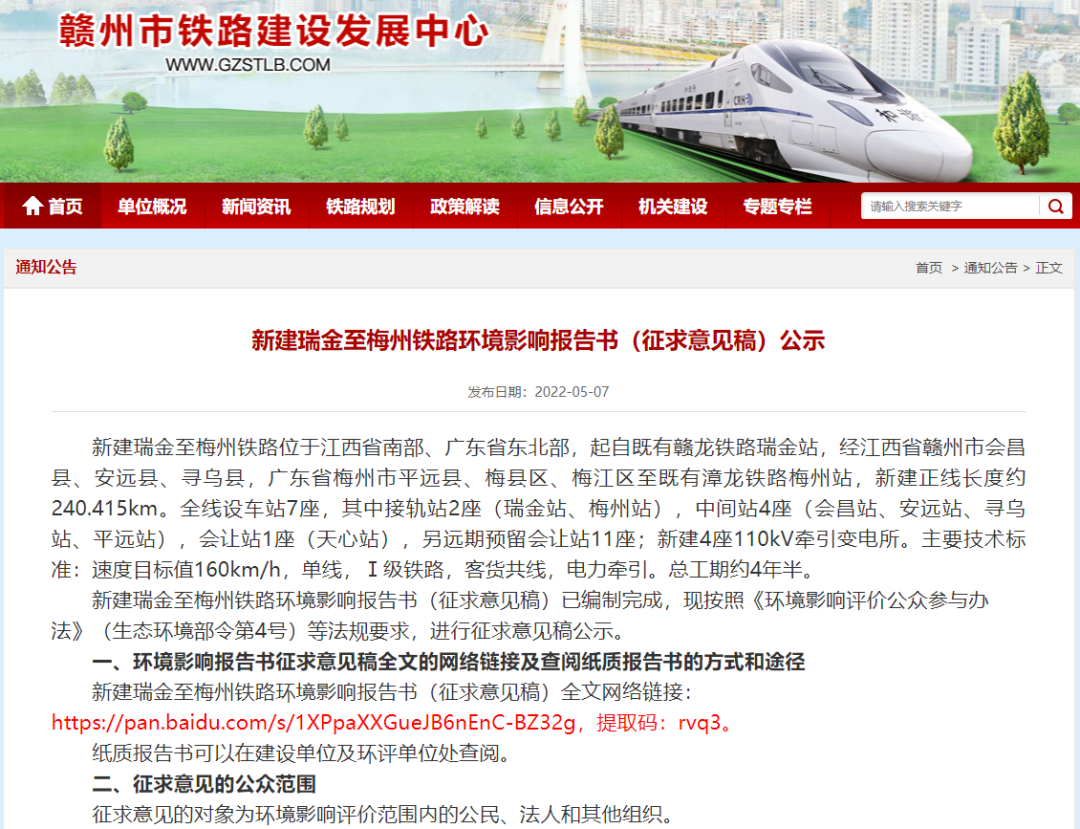 On May 7, 2022, the "Announcement of the Environmental Impact Report of the New Ruijin-Meizhou Railway (Draft for Comment)" was officially released. At present, the preliminary design appraisal and repair of the project has been completed and will be approved, and construction is expected to start before the end of 2022.