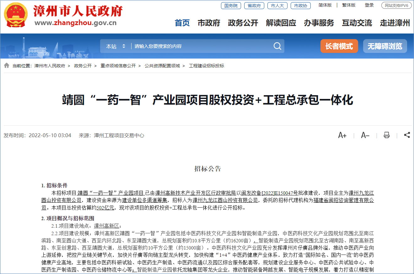 2022年5月10日,漳州市工程项目交易中心发布漳州靖圆一药一智产业园项目股权投资+工程总承包一体化招标公示,所属行业房建,招标人漳州九龙江圆山投资有限公司,项目总投资约502亿元。